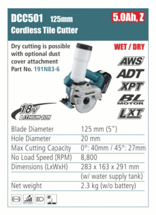 MAKITA DCC501 Cordless Tile Cutter 125mm blade diameter, without battery