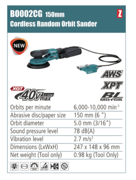 MAKITA Cordless Random Orbit Sander 125mm/150mm abrasive disc size without battery