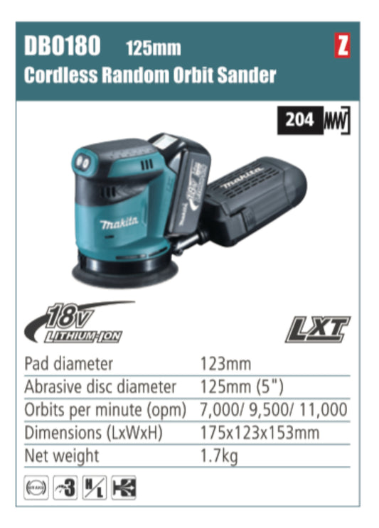 MAKITA DBO180 Cordless Random Orbit Sander 125mm abrasive disc diameter without battery