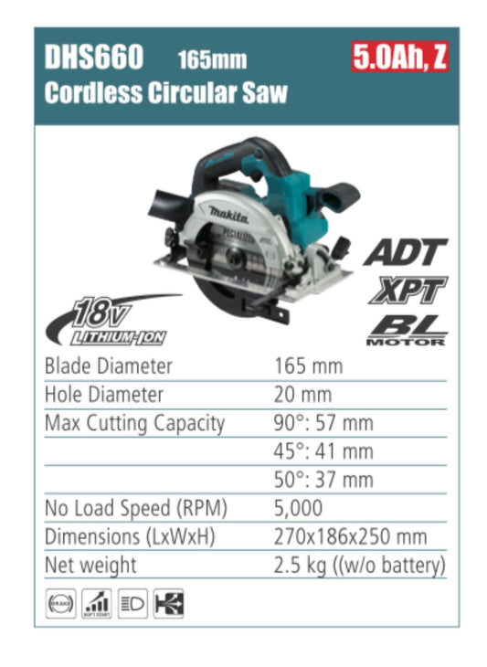 MAKITA circular saw cordless 165mm blade diameter, without battery