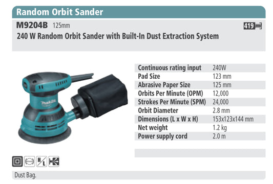 MAKITA M9204B Random Orbit Sander with Built in Dust Extraction System,125mm abrasive paper size, 240W