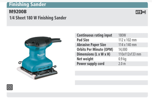 MAKITA M9200B 1/4 sheet 180W Finishing Sander, 112 X 102mm pad size