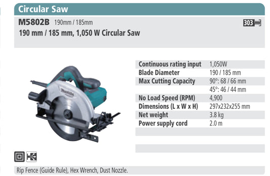 MAKITA M5802B Circular Saw 190mm/185mm blade diameter 1050W
