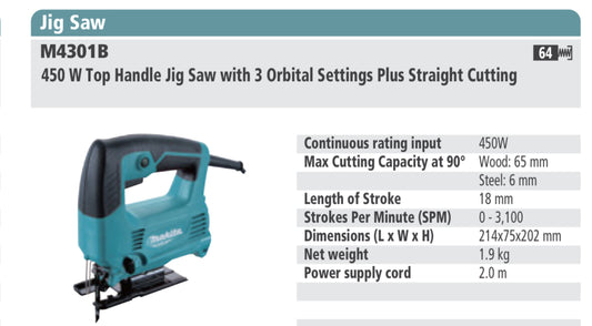 MAKITA M4301B JIG SAW Top handle Jig Saw with 3 orbital settings plus straight cutting, 450W
