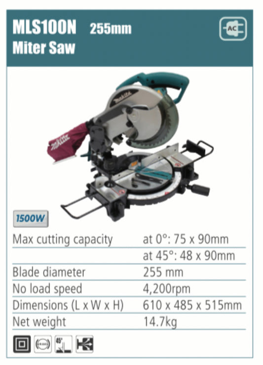 MAKITA MLS100N Miter Saw 255mm blade diameter, 1500W