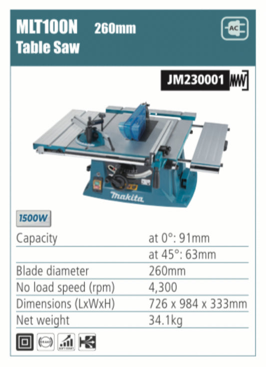 MAKITA MLT100N Table saw 260mm blade diameter, 1500W