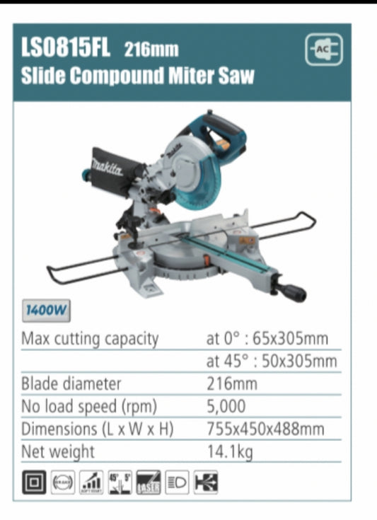 MAKITA LS0815FL Slide Compound Miter Saw 216mm blade diameter, 1400W