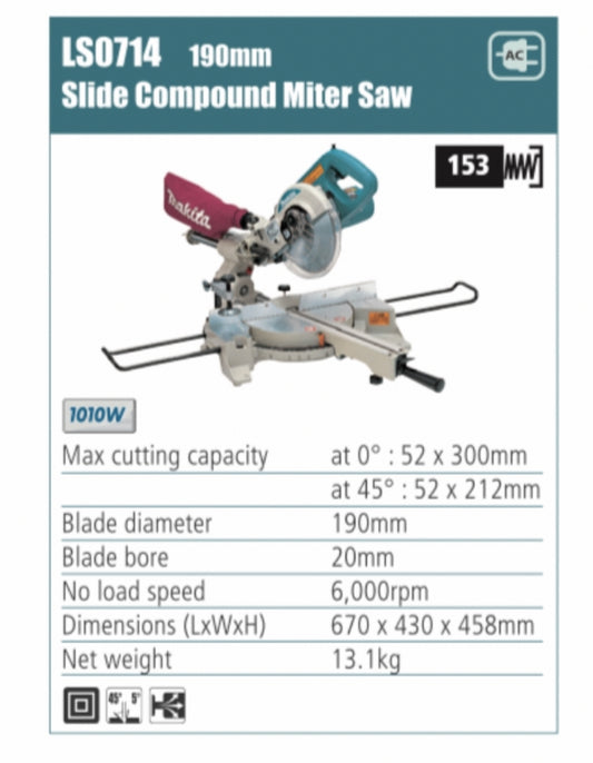 MAKITA LS0714 Slide Compound Miter Saw, 190mm blade diameter,1010W